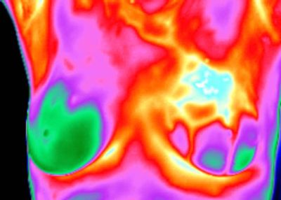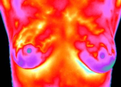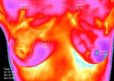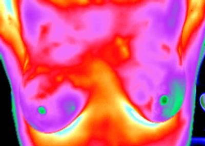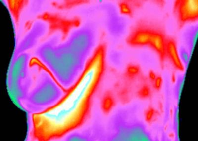 The third classification of the Marseille system defines a single thermology sign and indicates an atypical metabolic or vascular process associated with a minor or equivocal (<10% to 20% as specified in the individual report) risk for confirming breast cancer. This may be based upon the discernment of an asymmetric and hyperthermic vascular or focal pattern, an asymmetric, diffuse and hyperthermic pattern involving a peri-areolar area or most of one breast, a discrete area in a vascular pattern that does not attenuate from the challenge procedure or an asymmetric physical distortion with local hyperthermia. It is likely that these atypical thermal features represent benign changes such as inflammation, acute cysts and/or fibroadenoma development, infection or personal variant. A thermology restudy in 120-180 days usually provides a differentiation. Clinical correlation is indicated for an association with a mass or abnormal skin changes that would have an additive effect on the overall risk for breast cancer. Strong familial or personal factors for breast cancer are also of additive risk. Other objective means of evaluating the breasts may be indicated. Experience demonstrates a targeted ultrasound as the single most effective means of following-up on atypical or abnormal breast thermology. Blood markers such as CA 15.3, CA 27.29, TRU-QUANT, creatin-kinase-BB and even elevated ferritin may be useful and X-ray mammography may be indicated in the context of a womens overall risk profile.